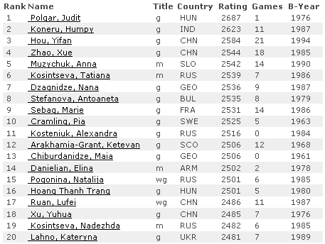 У женщин, неудачный результат в Чемпионате Китая стоил Хоу Ифань 6-ти пунктов – 2610 Elo. Поменялись местами Чжао Сюэ и Гунина.