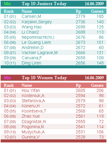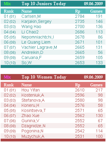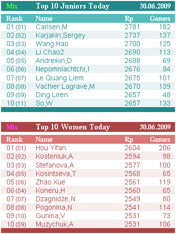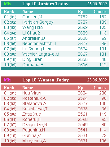 У юниоров Андрейкин переместился с 7-й позиции на 5-ю, прибавив 14 пунктов – 2686. Он вплотную подошел к Ли Чао и близок к границе первой 30-ки – 38-я позиция в общемировом зачете. Дин Лижень сравнялся с Каруаной – 2656 и 9-10 позиции на двоих.