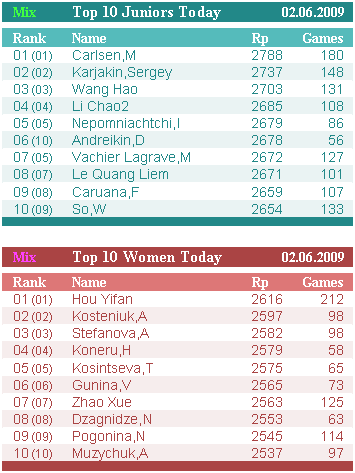 Из других изменений: Леко поднялся с 9-й позиции на 7-ю, отодвинув Раджабова и Яковенко. Грищук вошел в десятку десятым, Свидлер переместился на 11-ю позицию. Гельфанд поднялся еще на одну позицию вверх – 12-й и 2747, это лучший перфоманс для него. Также лучшие перфомансы у Пономарева – 2730, Широва – 2726, Тимофеева – 2714 и 23-я позиция.