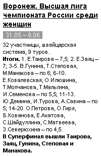 У женщин с 7-й на 10-ю позицию опустилась Гунина. За 2 недели она потеряла 37 пунктов (!). Причина – относительно неудачное выступление в Чемпионате России среди женщин относительно своего же результата в прошлом году, тогда была победа с результатом 7,5/9 и отрывом в 1 очко от 2-3 мест (партии прошлогоднего чемпионата «ушли», партии этого «пришли»)