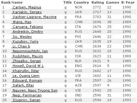 В 30-ку вернулся Ван Хао, удачно выступающий в Чемпионате Китая – 26-я позиция и 2703. Покинул ее Акопян.