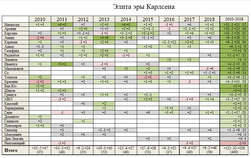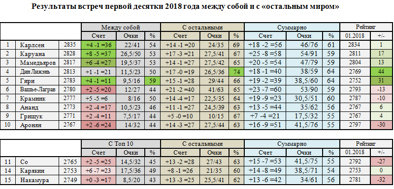 Таблица элиты эры Карлсена с ноября не претерпела больших изменений, только У.Со выбыл из Топ-10. Да и откуда взяться большим изменениям - ведь это, в основном, таблица истории.