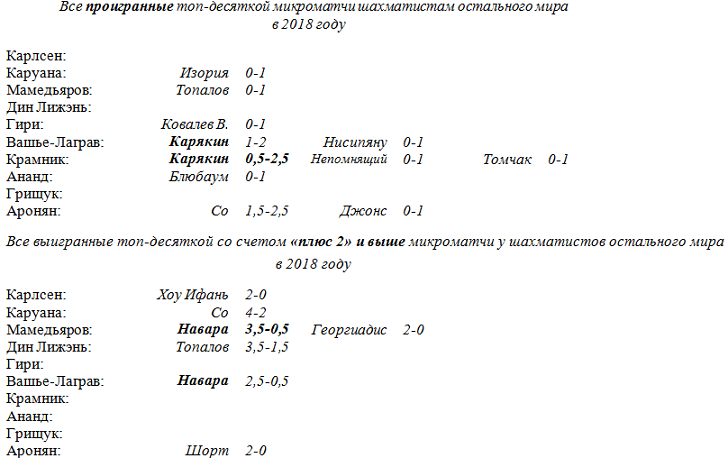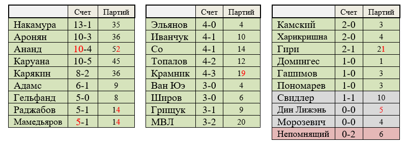 | Ровно половина из 42 состоявшихся мини- и микро-матчей (и одного "полноценного") завершилась результативно. В трех матчах перевес одной из сторон составил "плюс 2" (в 2017-м не было ни одного, в 2016-м таких было шесть, а в седьмом Каруана превзошел Накамуру с результатом "плюс 3") |