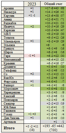 Грищук, например, в прошлом году сыграл ненамного больше, но в 19 партиях потерял 19 пунктов. |