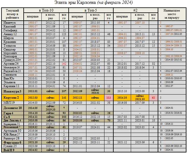 Последние новости об элите эры Карлсена относились к прошлому сентябрю (см. чуть выше). И вот свежая новость: в феврале к элите неожиданно присоединился "давно забытый" бывший вундеркинд Вэй И.