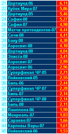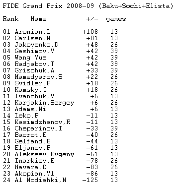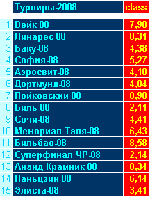 С другой стороны, у Ананда несколько большая стабильность, нет случаев 7-х и 9-х мест. За последний год, в Вейке-08 и Линаресе-08 он также стоял выше.