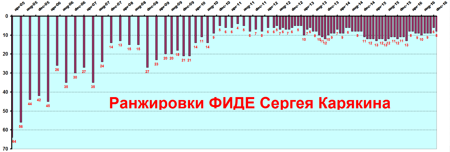 Jacob08: В дополнение к рейтинговым перспективам №3 в списке турнира, и ввиду дискуссий об оценке расположения Карякина в мировой иерархии, даю диаграмму "Ранжировки ФИДЕ Сергея Карякина".