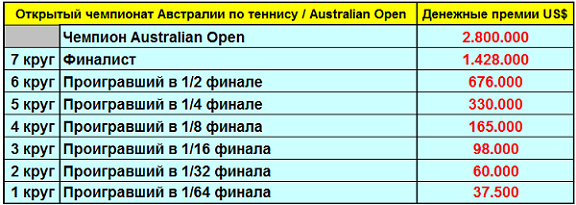 Не желая оставлять форум совсем уж без "денежной информации", и отнюдь не для каких-либо сравнений, привожу вместо этого) табличку округлённых величин денежных премий в Открытом чемпионате Австралии по теннису / Australian Open, жеребьёвка которого по совпадению тоже состоится завтра в Мельбурне. Напоминаю, что премии в мужском и женском турнире идентичны.