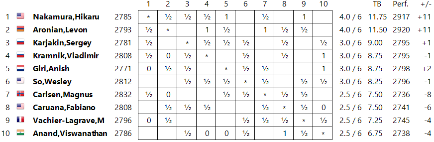 Магнусу и финиш турнира предстоит не самый простой: его экзаменуют два экс чемпиона мира играя белыми фигурами и недавний претендент на престол отбивается от Магнуса черными. Проиграть то он им наверное не проиграет - но выиграть кого то у из этих трех богатырей находясь в плохой форме тоже будет проблематично.