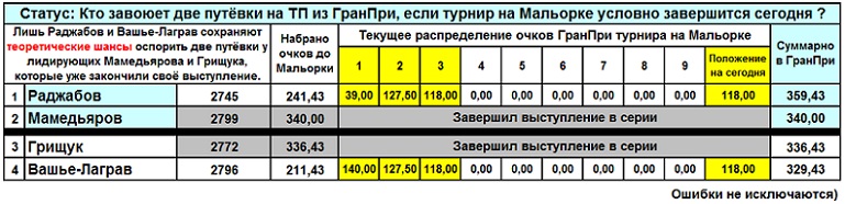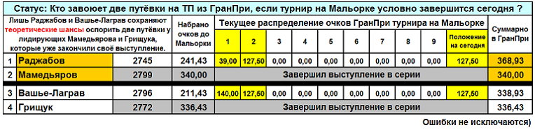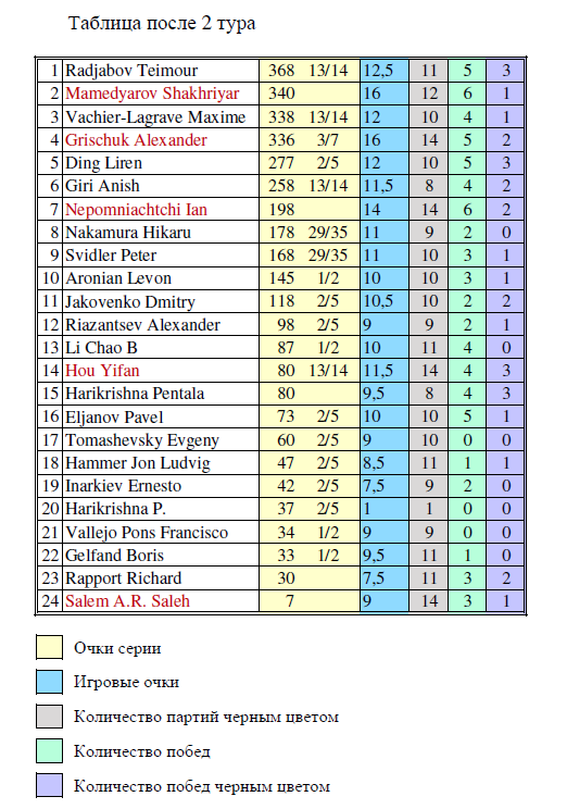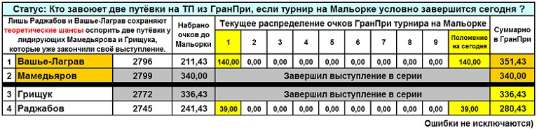 А ведь мы сейчас имеем дело с простейшей ситуацией. Всего двое из всего турнира состязаются в том, чтобы превзойти две фиксированные суммы - Мамедьярова и Грищука. Или только одну - меньшую - сумму Грищука. (Разница между суммами крайне мала, но "зазор" есть!)
