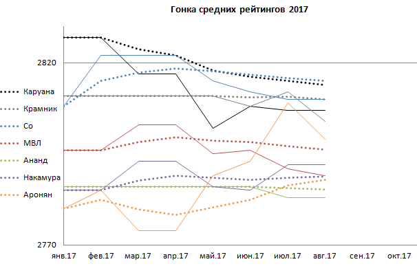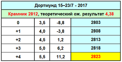 Дополнительная интрига турнира в Дортмунде состоит в том, что теоретически, при суперудачном результате +4 => 5,5/7 у ВБ есть возможность обойти Магнуса на 1 ЭЛО в списке ФИДЕ в августе. Это вытекает из рейтинговых перспектив Крамника: