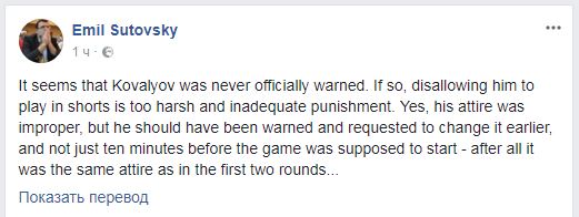 Интересно, почему Вам так сильно Сутовский важен. Не в первый раз замечаю. Да, он интересный человек - хорошо пишет. И полезен, чтобы получить инсайд, когда этот инсайд действительно у него есть. Но на хорошего аналитика всё-таки не тянет. Например, сейчас непроверенную ерунду пишет: 1) что Ковалёву якобы запретили играть партию; 2) что шорты неприемлемы, и Ковалёва нужно предупреждать было. При том, что пока никто не привёл никаких подтверждений, что шорты запрещены. И сам он ссылок на правила по своему обыкновению не приводит.