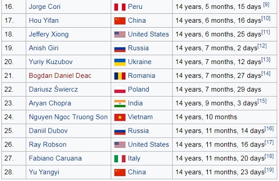 Да, раньше звание гроссмейстера давали за заслуги посолиднее, а ведь были Фишер, тот же Крамник, да и Таль, я думаю, уже лет в 15 играл в "бисову силу". А, ну ещё Капабланка и Решевский сразу вспоминаются. |
