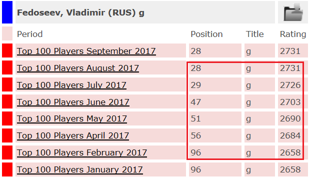 Jacob08: Приятная для российских шахмат причина кроется в том примечательном "прыжке тигра"), который Федосеев осуществил за отмеченные полгода: + 73 ЭЛО => +68 позиций.