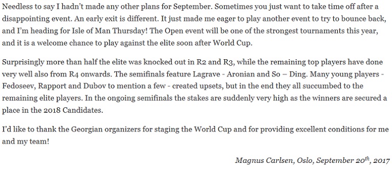 | Ukrfan: Если МВЛ руководствовался тем и же соображениями - его право. Магнус убедительно доказал на ТБ, что он был прав (моральный же аспект его действий не обсуждаю, поскольку считаю, что при ничьей чемпион должен просто сохранять титул). Докажет ли Максим - увидим. | Тут Вы совершенно правы. Именно окончательный результат будет служить доказательством кто из соперников правильно применял хитрости и уловки, а кто перемудрил.