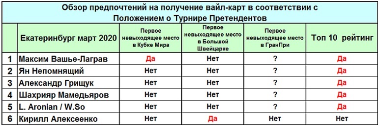 | Wild card for Candidates 2020 will be determined as follows: Кирилл Алексеенко (Kirill Alekseenko) - if both Ян Непомнящий (Ian Nepomniachtchi) and Grischuk qualify through GP, or the match to be staged between these two (three) Russian players. |