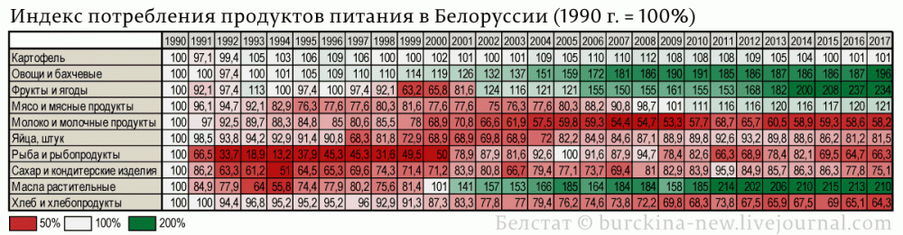 Курс доллара волновал примерно 5 процентов населения, остальных интересовал курс еды. Как ограбили, ясно видно по кривой ОПЖ. Если этого мало, вот табличка по потреблению основных продуктов питания.