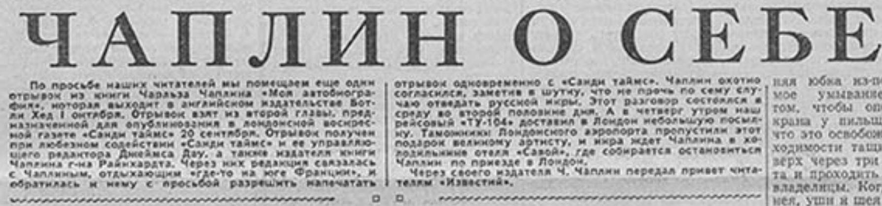 В 1964 году лондонский корреспондент «Известий» узнал о скором выходе книги Чарли Чаплина «Моя автобиография» и обратился к режиссеру с просьбой опубликовать отрывок в СССР. Чаплин согласился и в качестве гонорара — вместо бессмысленных рублей — попросил черной икры. «Известия» просьбу выполнили и переправили в Лондон на самолете четыре килограмма черной икры из Елисеевского магазина — в кастрюле из газетной столовой, наполненной льдом, взятым у мороженщиц на Тверской.