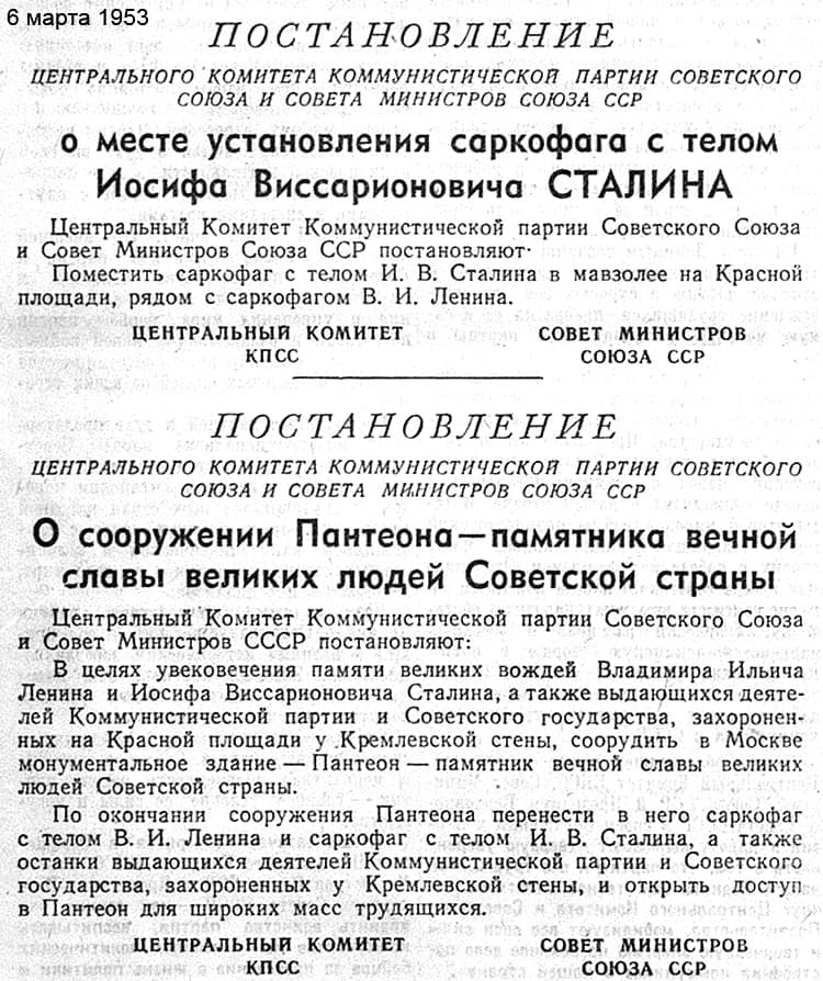 Кстати, вышвырнуть Ленина вместе со Сталиным из Мавзолея постановили сразу после смерти Сталина. И захоронить трупы в некоем пантеоне, неизвестно где находящемся, вместе со всеми трупами с Красной площади. Но потом постановление тихо похерили и забыли.