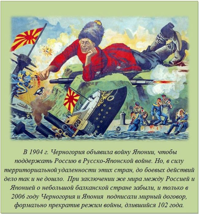 Помощь Черногории фактически заключалась в небольшом отряде добровольцев, влившихся в российскую армию. Вскоре она перестала быть самостоятельным государством. В 2006 г Япония, признав независимость отделившейся от Сербии Черногории, заявила о прекращении состояния войны.