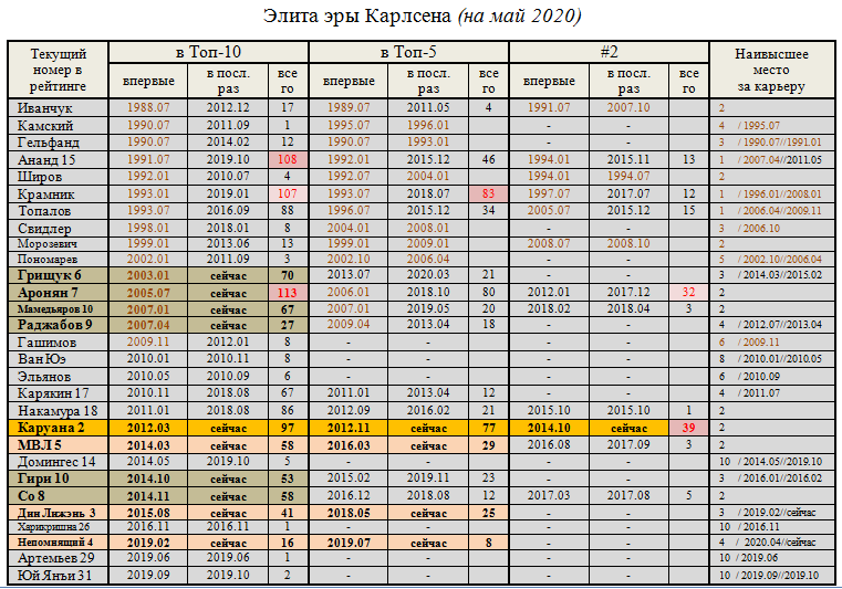 На этот счет у нас есть в теме Top GrandMasters Today отдельная (и ведущаяся на регулярной основе) статистика, но после того как туда сгрузили очередной выпуск сериала "Фишер-Гири", найти нужную таблицу (которая должна быть датирована январём) не представляется легкой задачей даже автору. Поэтому приведу её по состоянию на 1 мая.