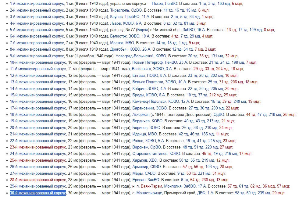 Я ожидал, что кто-нибудь напишет это) Дело в том, что управление 29-го мехкорпуса Забайкальского ВО было расформировано 7 мая 1941 года, а вопрос был о 22 июня 1941 года, т.е. мехкорпусов на эту дату было 29, а не 30 (№ 1-28, 30).