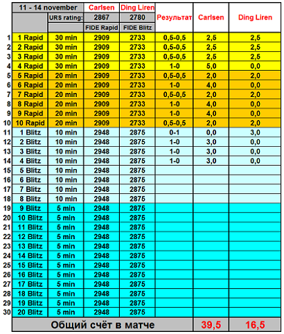 Jacob08: Забавно, что маловероятный и скорее всего недостижимый разгром +10 (15,0 - 5,0) в пользу чемпиона приведёт к ситуации, когда впервые в истории белковый шахматист, чей блиц-рейтинг на сегодня 2948, превысит (3008) рейтинговую границу 3000.:-)
