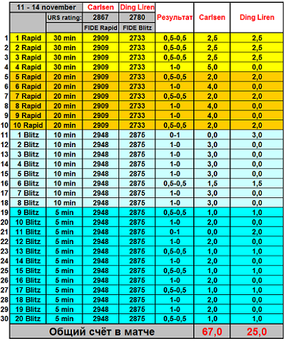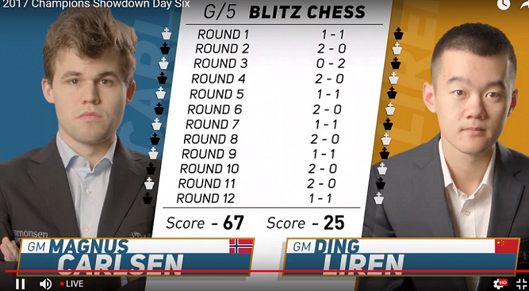 Carlsen finishes with a draw, and beats Ding Liren with the incredible score 22-8 (67-25)! If not for a certain FIDE rule, Carlsen would\'ve had an unbelievable blitz rating of 3008! |