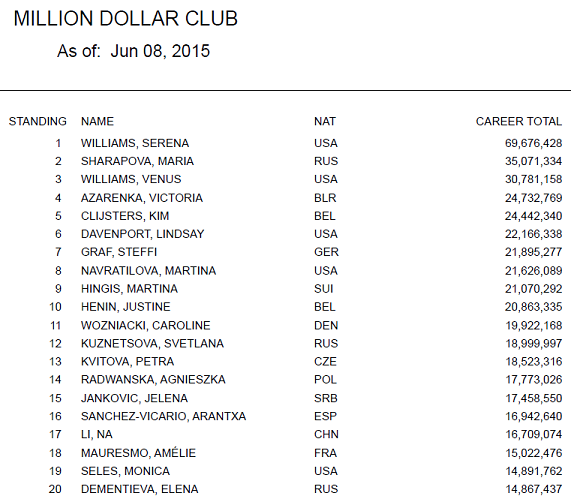 | Это верно, но до Серены ей как до неба, точно так же, как и Курниковой. Так что этот показатель (доходы) не показывает ровно ничего... кроме себя. |