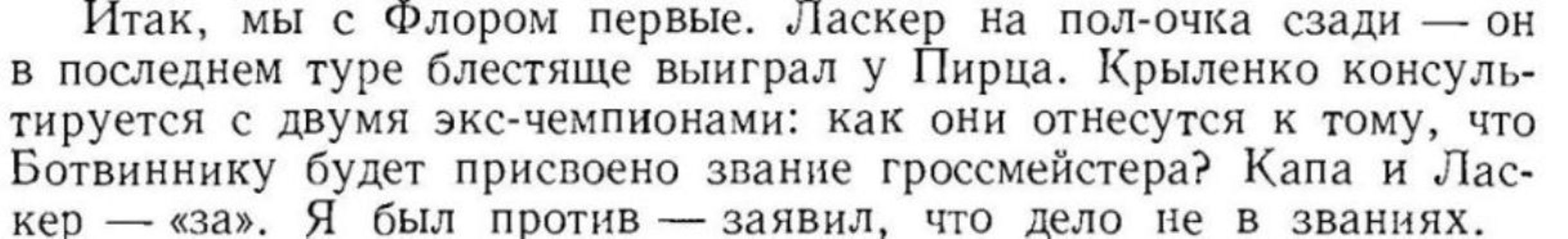 Понятно, сам Ботвинник был против присвоения звания, решил, видимо, до старости в мастерах ходить. Интересно, только откуда он узнал, что Крыленко обращался по этому поводу к Капе и Ласкеру. От Крыленко – вряд ли, остается предположить, что два экс-чемпиона сами побежали к нему наперегонки, может, и им тоже присвоят. Ласкер решил даже по этому поводу на ПМЖ в Москве остаться, глядишь, если бы не репрессии, может быть, и получил. Прецеденты такие были, Второй победитель ММТ, Флор, стал гр. СССР в 1943 г., другой участник турнира, Лилиенталь – в 1940 г., а один из претендентов на звание ЧМ, Керес, получил звание гроссм. СССР в 1941 г. за второе место в соответствующем матч-турнире. Вот, наверное, обрадовался. |