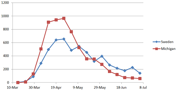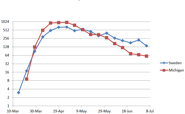 8. Голословно утверждается, что некий «анализ» в апреле доказал, что карантин не спасет людей. Также утверждается, что новые случаи в мире растут несмотря на карантинные меры. Но замалчивается, что рост этот идет как раз за счет мест, где власти были против таких мер (Бразилия), где меры невозможно реально воплотить (Мексика и т.п.) или где меры были отменены (отдельные штаты США). Привычно замалчивается, что в Швеции, где меры были частичные (хоть и не нулевые!) смертность во много раз выше, чем в ее соседях, и даже выше, чем в США. При том, что у соседей уже почти нет новых случаев, а Швеция недавно поставила новый рекорд. Есть публикации с количественным анализом того, скольких жизней стоил шведский эксперимент. Но они написаны экспертами, а им, согласно Новопрудскому, верить нельзя.
