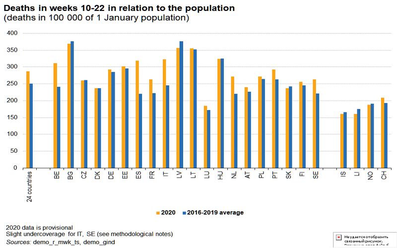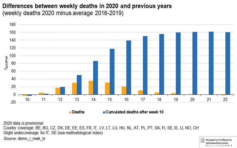 24 страны, 160 тысяч избыточных смертей. В некоторых странах и упала смертность ниже среднего (в Латвии, Болгарии, Чехии, Словакии).
