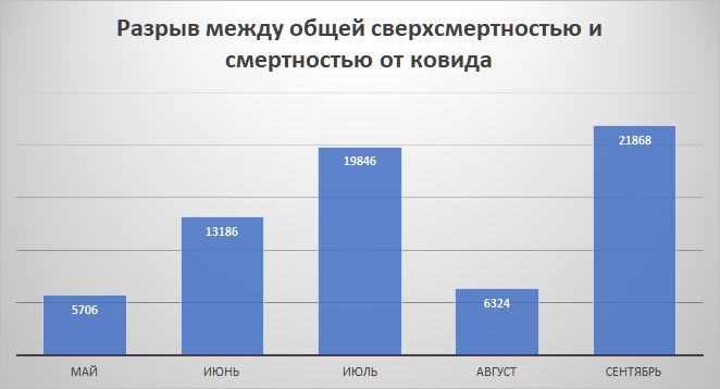 Разумеется, именно это вы и услышите. Потому что по приведённым вами же данным разрыв между общей сверхсмертностью и смертностью от ковида с мая по сентябрь стабильно рос - как и должно быть по общим соображениям отложенного эффекта (не только прекращения плановой медпомощи, но и собственно карантина). Единственным исключением явился август, когда этот разрыв упал даже несколько ниже июньского (хотя и остался выше майского), но это, скорее всего, обычная флуктуация. А может быть, эффект летнего отдыха в хорошем климате, что является сильным поддерживающим фактором для больных ССЗ.