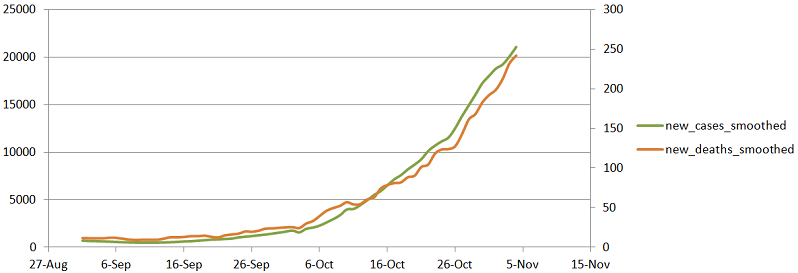 Вы же там доказывали, что волна смертей следует за волной заражений с разницей 2 недели. Ну да, примерно так и должно быть, только здесь разница в другую сторону . В сентябре еще никакой второй волны не было.