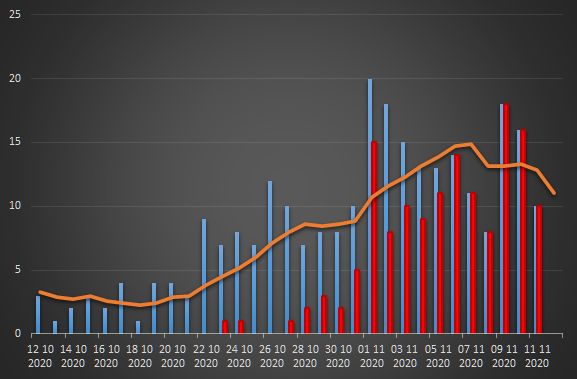 Пик пока приходится на 1 ноября. Вероятнее всего, на этой неделе умирало уже около 30 человек в день или более. То есть за месяц смертность выросла раз в 10
