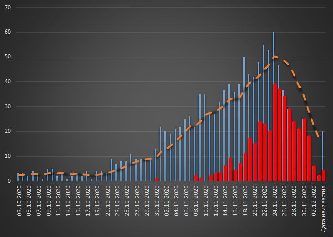 Смерти в Швеции. Красным - внесенные в статистику на этой неделе (386, на 40% больше, чем внесено на прошлой неделе, но большинство внесенных в статистику умерли в предыдущие недели, как обычно). Скорее всего, сейчас в среднем умирает уже 80+ в день.