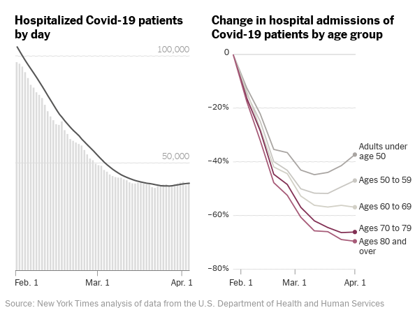 Health officials say vaccination rates, which are higher among the priority older groups, have likely contributed to the lowered admission for the 65+ crowd. The three vaccines available in the U.S. have all shown to be effective in reducing the chance of severe COVID-19 and thus hospitalization. |