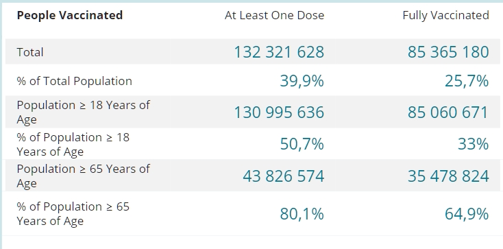 Преодолели планку в 50% взрослого населения, получивших 1 дозу, и чуток осталось до 1/3 полностью вакцинированных