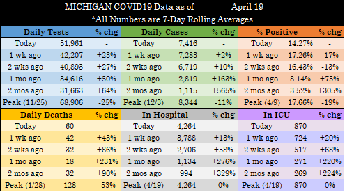 As of Wednesday, April 7, Michigan hospitals were treating 3,595 patients with confirmed or suspected cases of COVID-19. That’s a significant jump from the 2,424 such patients one week earlier, and less than 1,000 patients a month ago. The latest week-over-week spike is the largest of its kind since the initial 2020 spring surge.