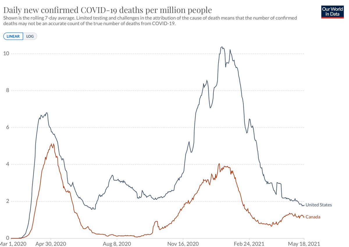 Так и меры жёстче, и комплайанс выше. 28 мая у нас обещают отменить комендантский час, и разрешить еду на террасах ресторанов (но не в помещениях). Также разрешат социализироваться (опять же вне помещений) частично привитым людям.