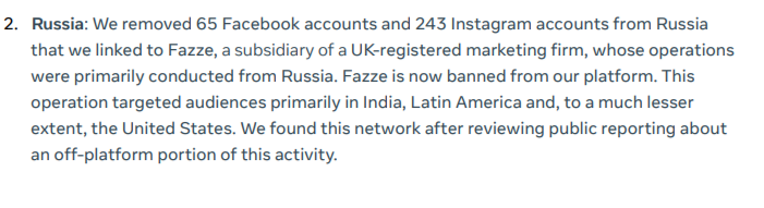 Отчет Фейсбука за июль. Забанены 308 российских аккаунтов в ФБ и Инстаграме, связанных с PR-агентством Fazze (зарегистрированным в Британии, но работающим в основном из России). Операции выявленной сети были в основном направлены на пользователей в Индии, Латинской Америке, и немного на жителей США.