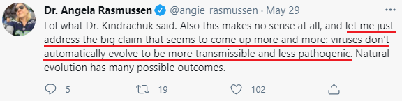| эволюция вируса в популяции в пользу большей заразности при меньшей смертности - это настолько общий тренд, что многие считают его аксиомой. |