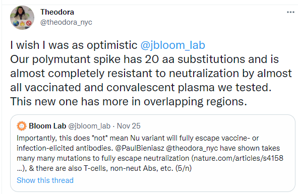 Концентрация нейтрализующих антител в плазме группы infected у них снижалась в ~50 раз, в плазме группы vaccinated - в ~80 раз, а в плазме группы infected-then-vaccinated - в 18 раз; последнего было достаточно для хорошего уровня нейтрализации у большинства, что вызывало у авторов сдержанную надежду. Однако, одна из авторов говорит, что омикрон содержит больше мутаций, чем эта химера.