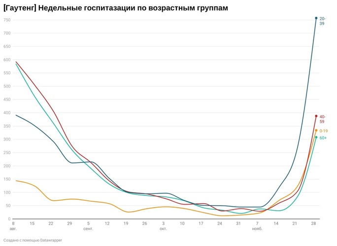 • За два первых дня этой недели в Гаутенге госпитализировали уже 700 человек (и это промежуточные данные, которые ещё сильно вырастут). За неделю Гаутенг, вероятно, преодолеет отметку в 3000−3500 госпитализированных.