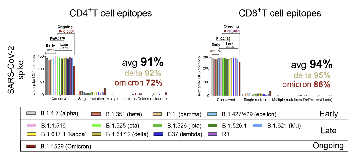 | T cell epitopes and vaccination? Here is the analysis of spike-only data. Since many variant mutations are in spike, we expect naturally a higher number of mutated T cell epitopes. On average 94% of CD8 and 91% of CD4 epitopes are still totally conserved. |