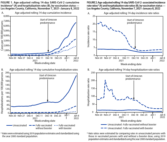 SARS-CoV-2 Infection and Hospitalization Among Adults Aged ≥18 Years, by Vaccination Status, Before and During SARS-CoV-2 B.1.1.529 (Omicron) Variant Predominance — Los Angeles County, California, November 7, 2021–January 8, 2022