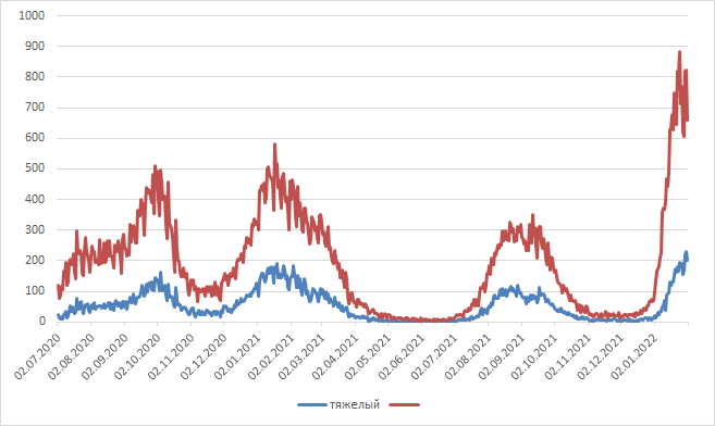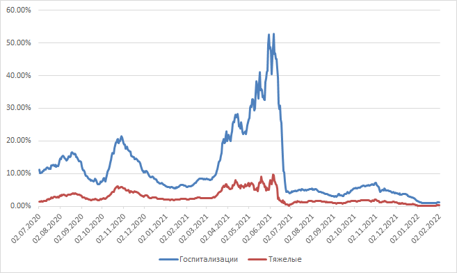 Это было к вашему "Очевидно, что чем больше заболевших, тем больше заболевших тяжело". С одной стороны да, а с другой нет. То есть может быть и такое, что выявленных больше, и намного, а госпитализаций меньше, а тяжелых даже и сильно меньше, чем в прошлые волны. Сейчас в Израиле выявляют на порядок больше, чем год назад, госпитализаций больше раза в полтора, а тяжелых примерно столько же. Но понятно, что в одну и ту же волну чем больше заболевших, тем больше заболевших тяжело.