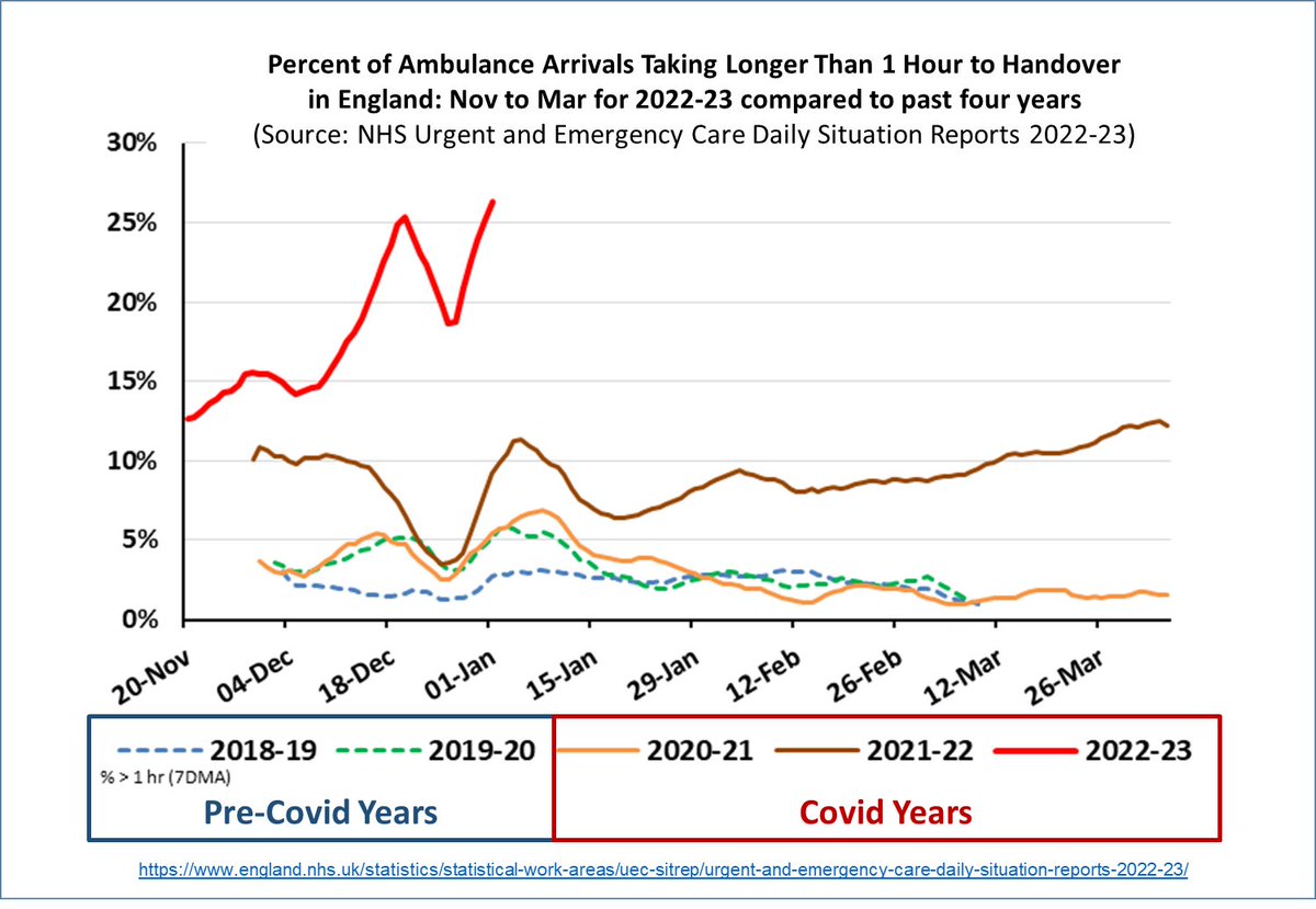 | Ambulance handover delays continue to be far worse than previous years - even at height of pandemic. When the next broader NHS metrics are released, expect to see record A&E waits and elective waiting lists - esp as so many elective operations have been cancelled this winter. |