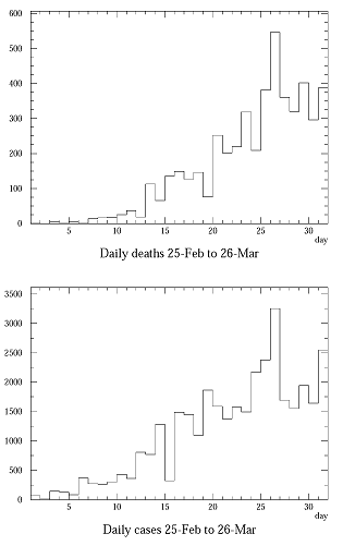 Первые суровые меры (закрытие границ, школ и торговых центров, отмена всех зрелищ, запрет скоплений людей, требование дистанции и т.п.) приняли уже 2 недели назад. Никакого замедления ни в один момент за эти две недели не было. |