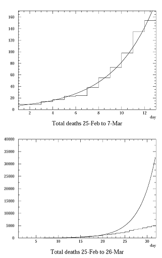 Я взял данные за первые 12 дней (до драконовских мер), натянул на них экспоненту, и экстраполировал эту экспоненту на сегодня (=business as usual, образ жизни не изменился).